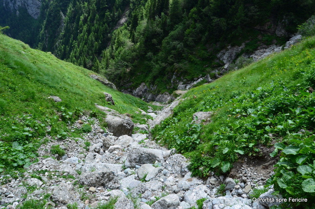 pe la 1850 de metri altitudine, virăm la dreapta, pe Brâna Portiţei, cam în linie cu baza Cascadei Caraiman.