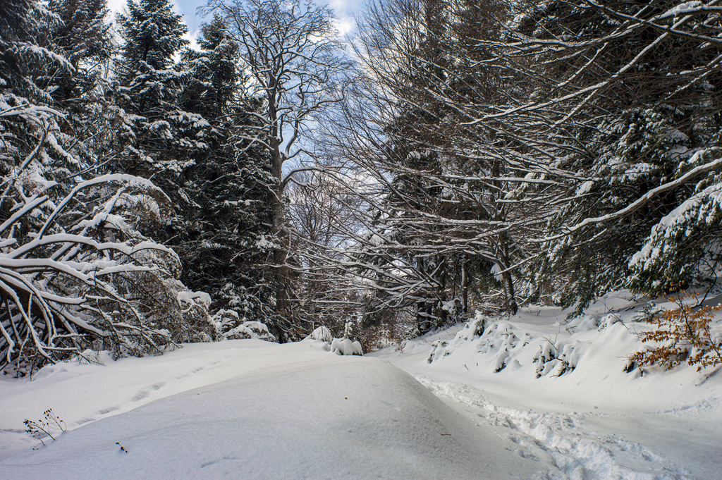 Faţă de ora 9-10-11, acum zăpada era răscolită, cu potecă în toată regula, semn că de atunci s-au aventurat mai mulţi oameni pe aici.